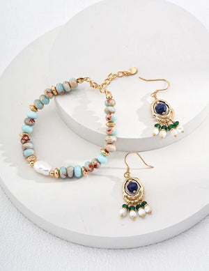 Design: Crafted with S925 sterling silver (Vintage Gold finish) paired with 5mm Lapis Lazuli, 3mm Synthetic Emerald and 4mm Shell (as shown). The 4cm drop design features a layered tassel detail, blending retro texture with rich gemstone tones—perfect for adding an elegant, bohemian touch to outfits.